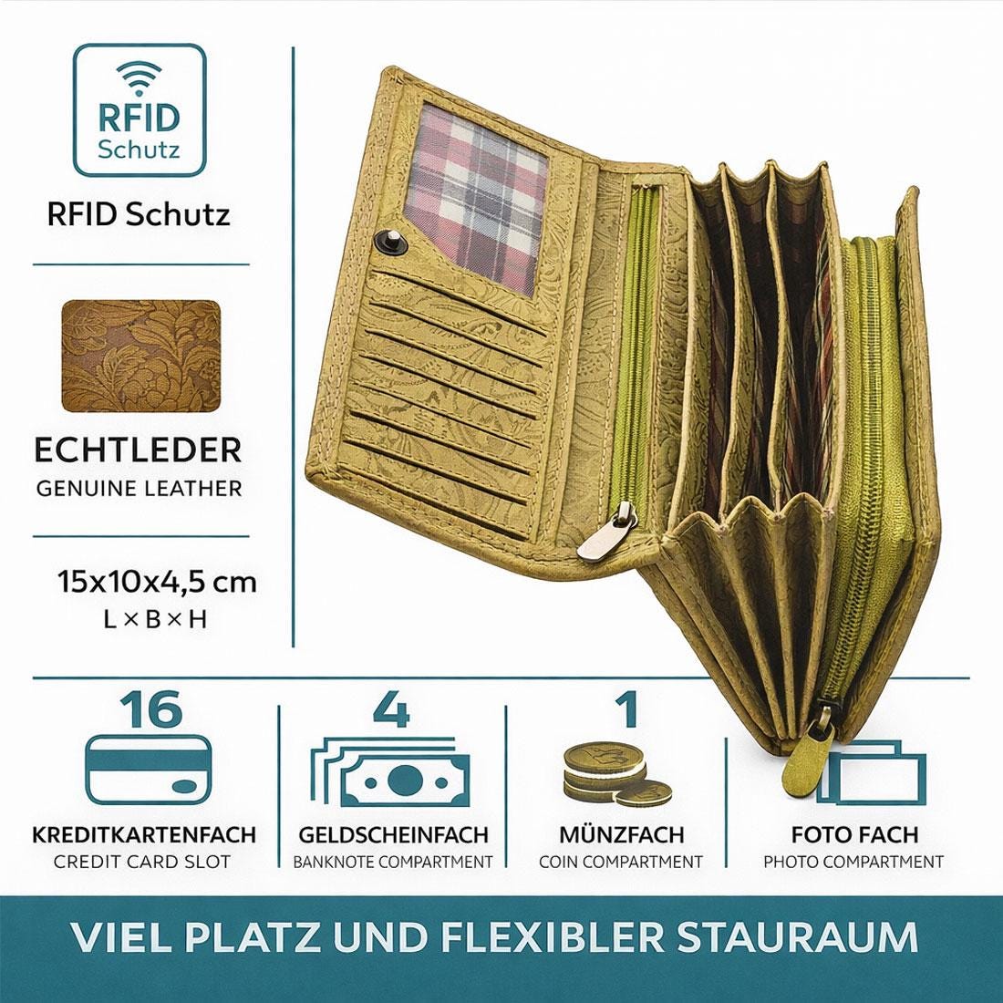 100% genuine leather, protective exterior embossed with antique style floral print, durable and water-repellent with RFID protection in light green color.