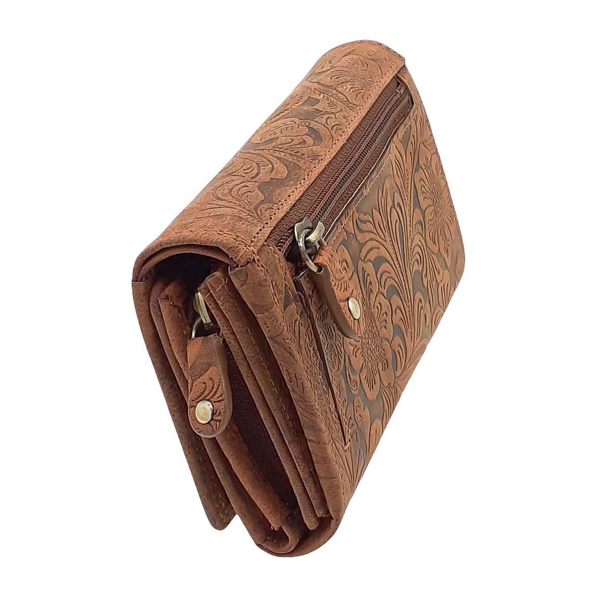 100% genuine buffalo leather, protective exterior embossed with antique style floral print, durable and water-repellent in brown color.