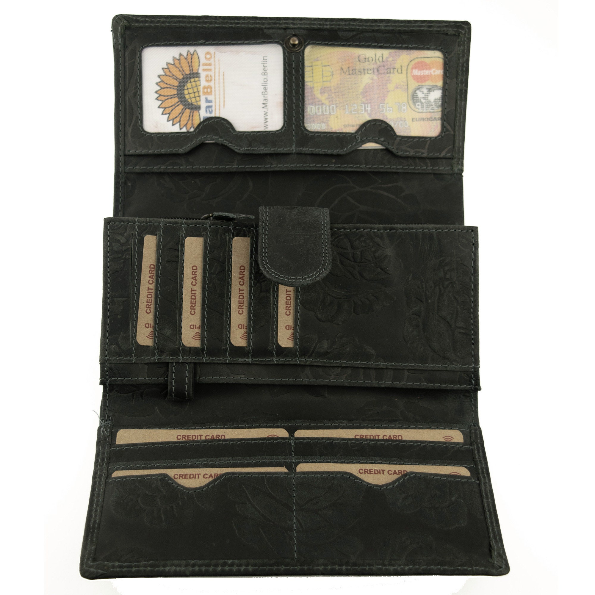 100% genuine buffalo leather, protective exterior embossed with antique style floral print, durable and water-repellent, black anthracite rose color.