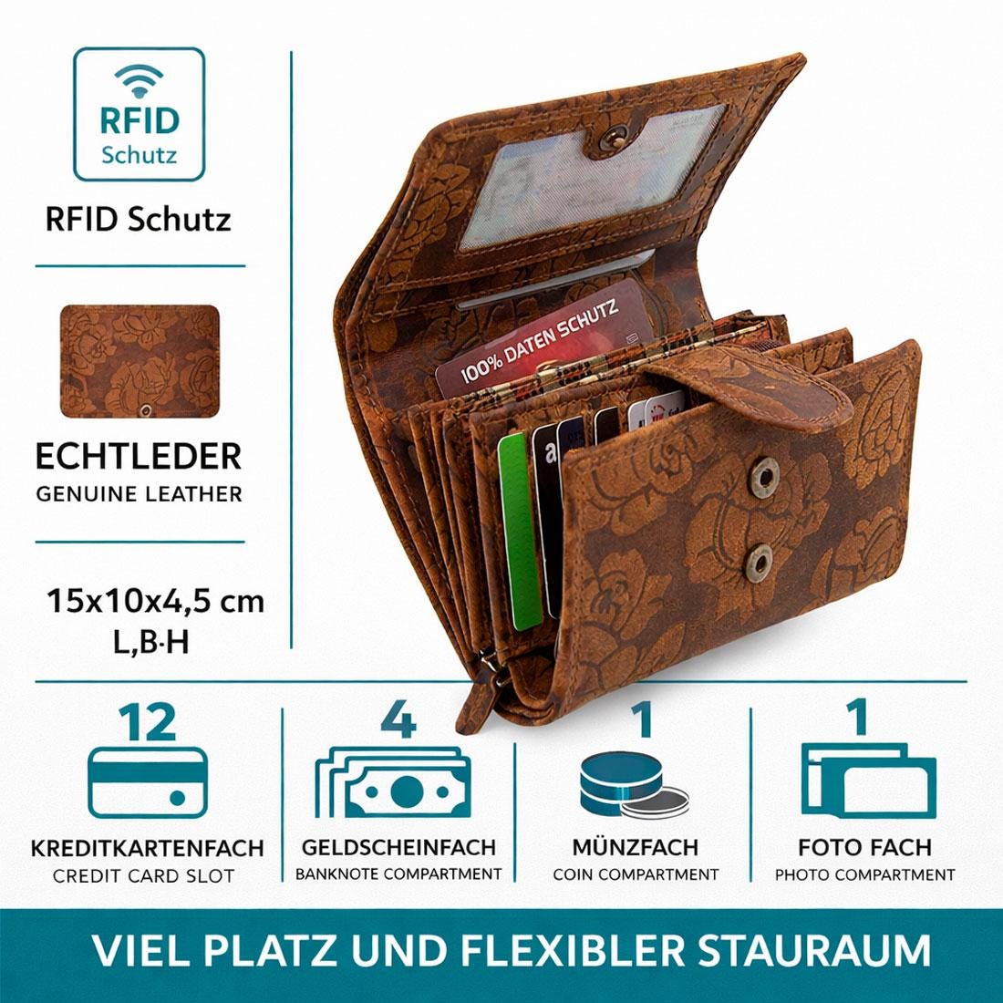 🌻 100% genuine buffalo leather, protective exterior embossed with antique style floral print, durable and water-repellent in brown.