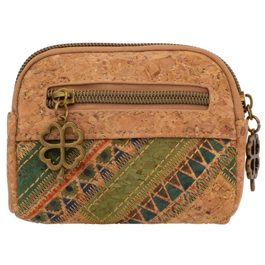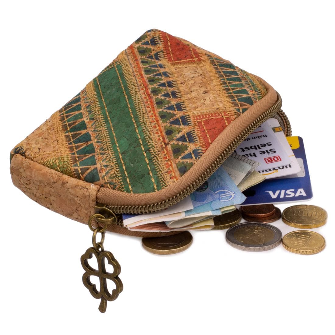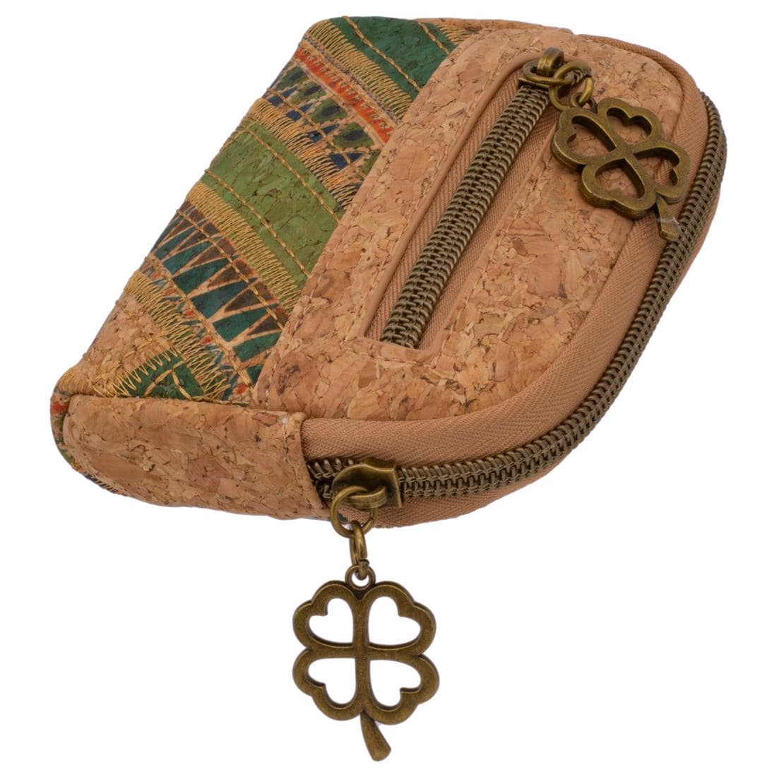 This handy cork bag combines sustainability with design: Made from natural, vegan cork and finished with a colorful boho pattern, it offers space for your essentials. A special detail—an antique four-leaf clover pendant—makes it a charming everyday companion. Whether as a mini wallet, key case, or small accessory—this piece sets a precedent for conscious style.
