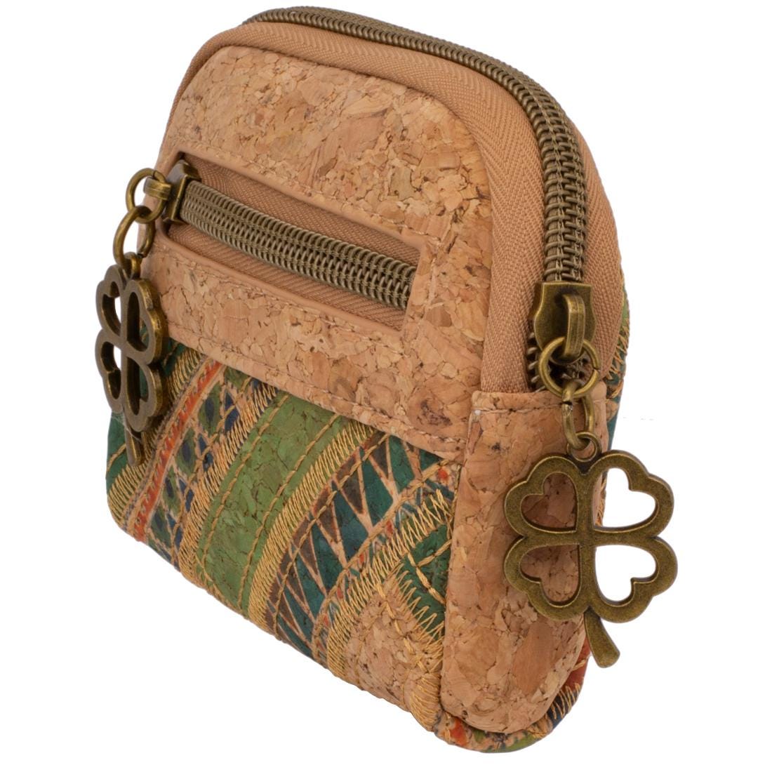 Vegan mini cork bag with boho pattern & lucky clover pendant – sustainable, stylish and perfect for on the go