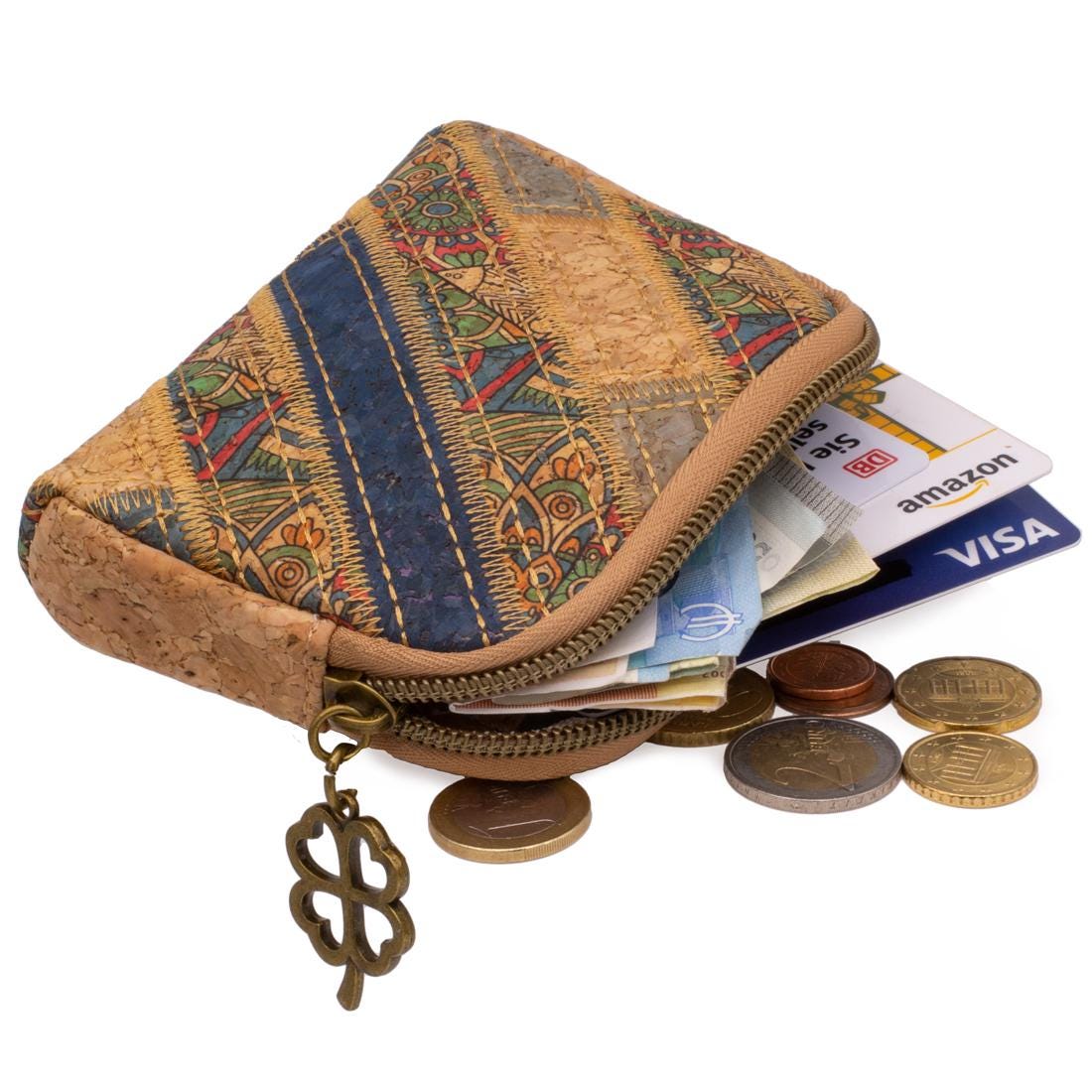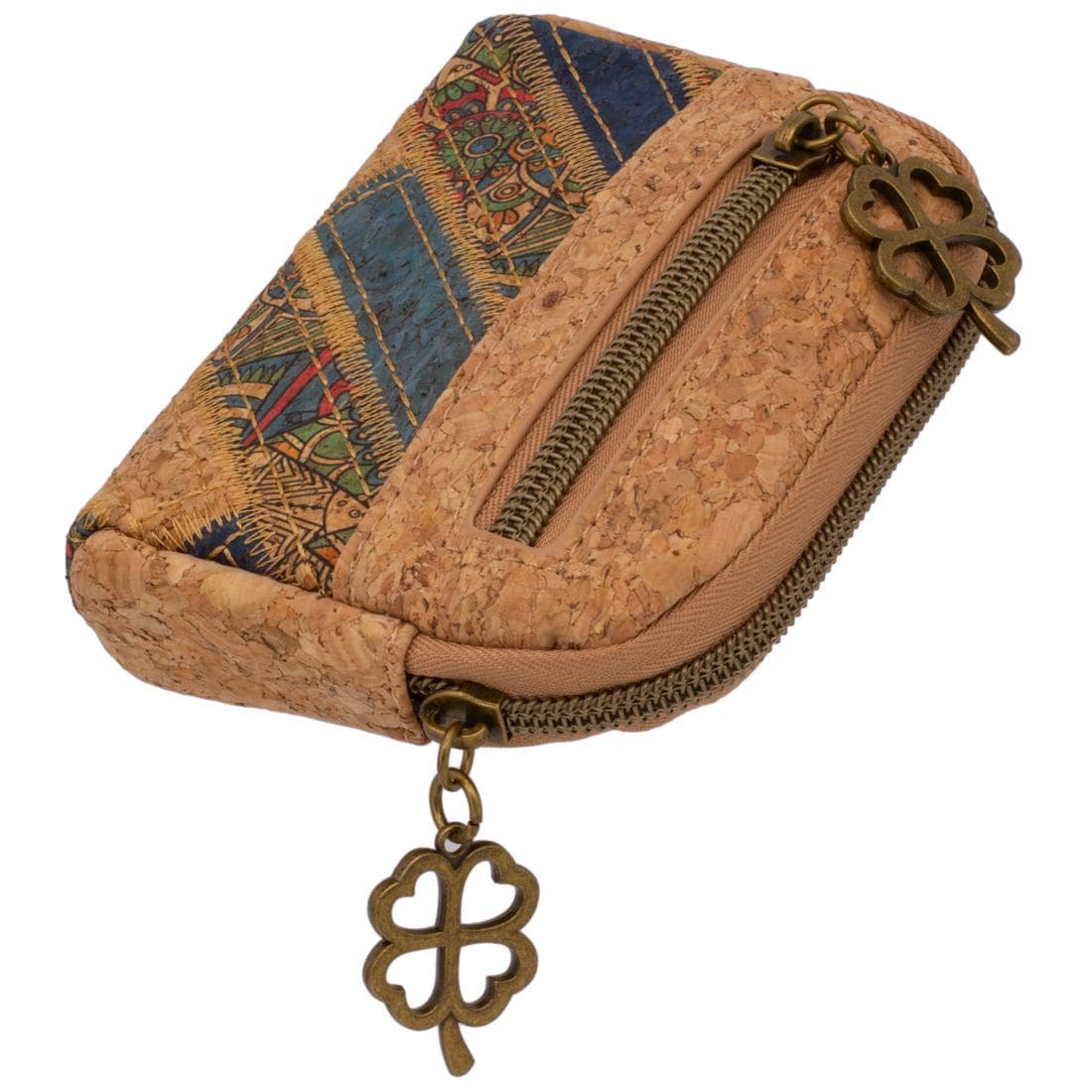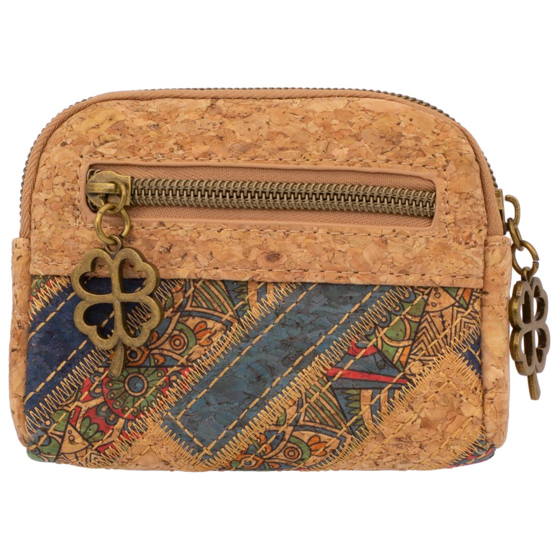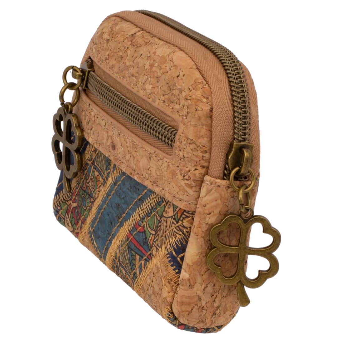 This handy cork bag combines sustainability with design: Made from natural, vegan cork and finished with a colorful boho pattern, it offers space for your essentials. A special detail—an antique four-leaf clover pendant—makes it a charming everyday companion. Whether as a mini wallet, key case, or small accessory—this piece sets a precedent for conscious style.