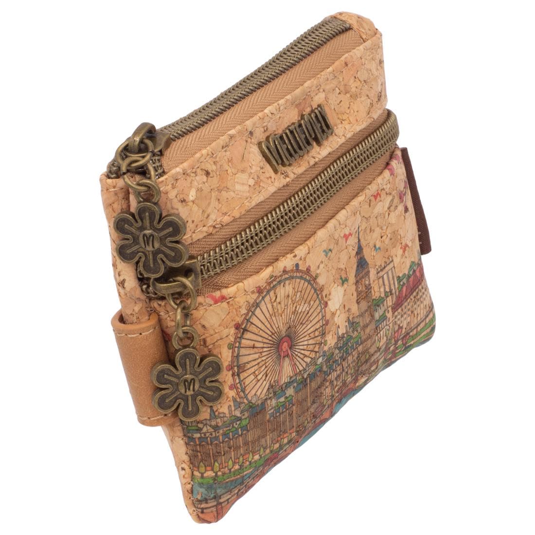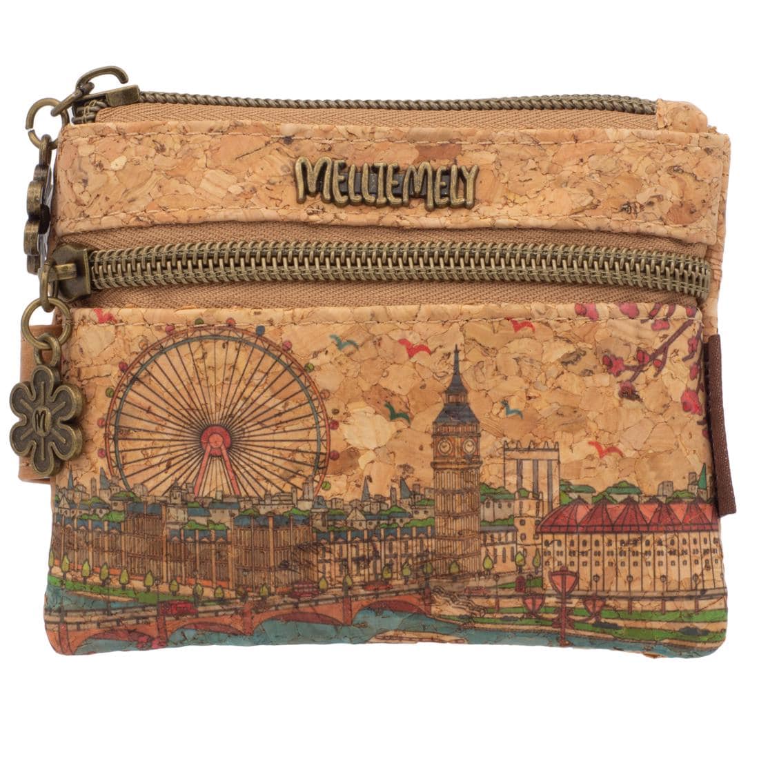 This unique mini wallet made from vegan natural cork combines urban inspiration with sustainable design. The high-quality print features iconic London landmarks like the London Eye and Big Ben – stylishly presented on eco-friendly cork. Featuring two zippered compartments, a charming four-leaf clover charm, and the "MELLIMELY" branding, this bag is not only practical but also a real eye-catcher for style-conscious globetrotters.