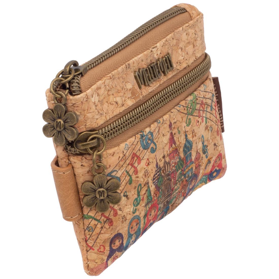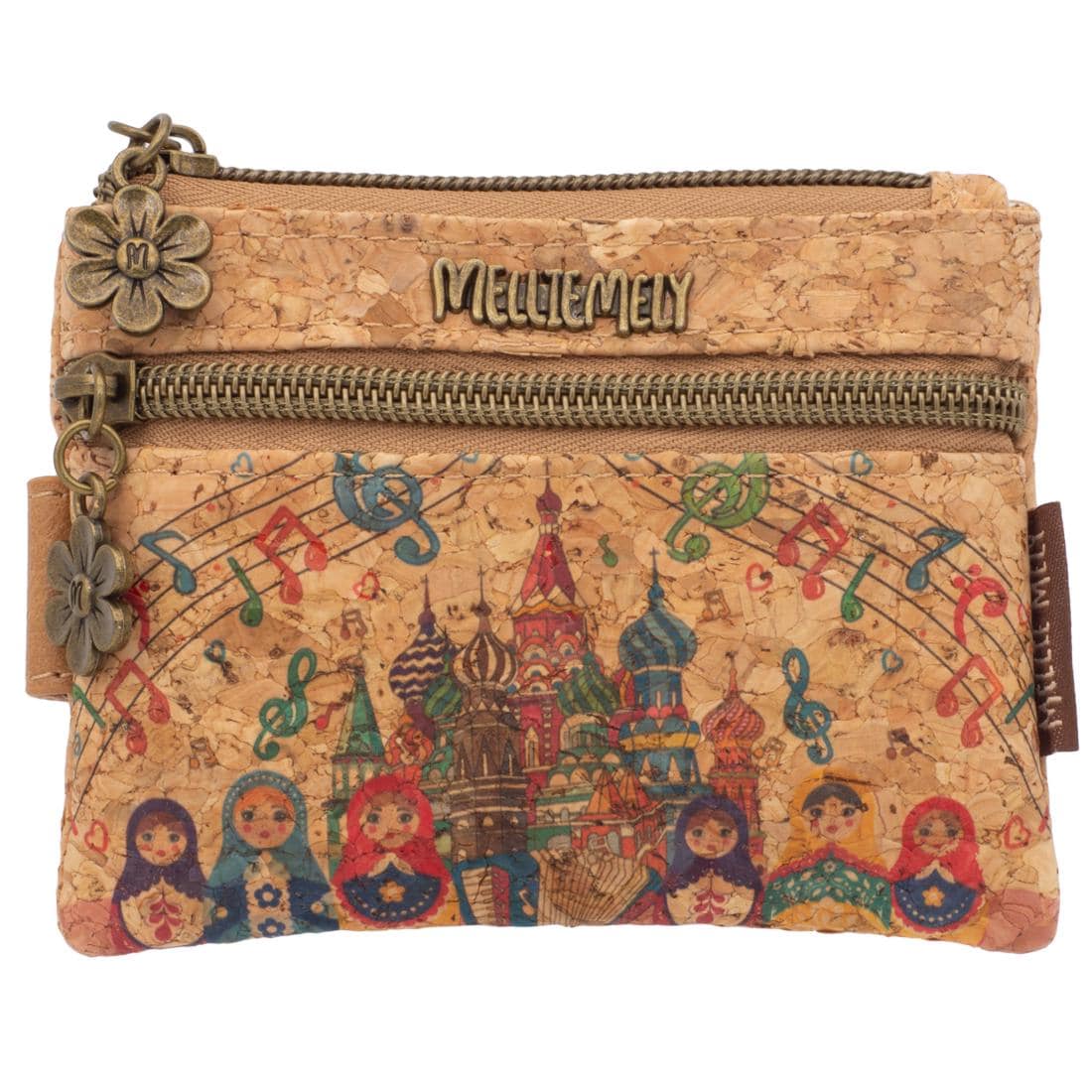 This lovingly designed mini wallet brings color and cultural charm to your everyday life. Crafted from vegan natural cork, it features a detailed motif with colorful matryoshka dolls, musical symbols, and a magnificent Russian-style cathedral. The two zippered compartments offer ample space for change, cards, or other essentials. The design is rounded off by floral metal charms and the embossed MELLIMELY logo—ideal for anyone who loves sustainable accessories with personality.