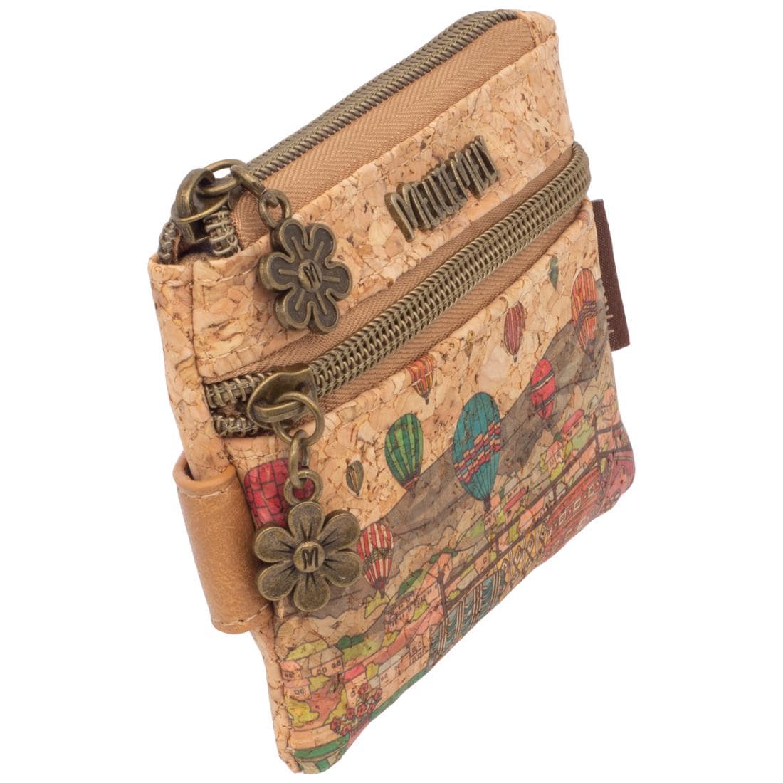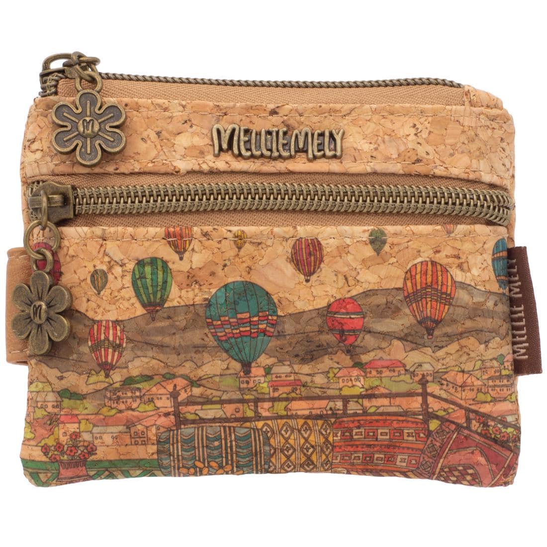 This meticulously crafted mini wallet made of high-quality natural cork will transport you to lofty heights. The colorful design features a scene filled with hot air balloons floating above an oriental-looking village—inspired by the magic of Cappadocia. Two practical zippered compartments keep things organized, while floral metal charms and the "MELLIMELY" logo give the accessory a playful look. Ideal for anyone who loves sustainable products with a wanderlust flair.