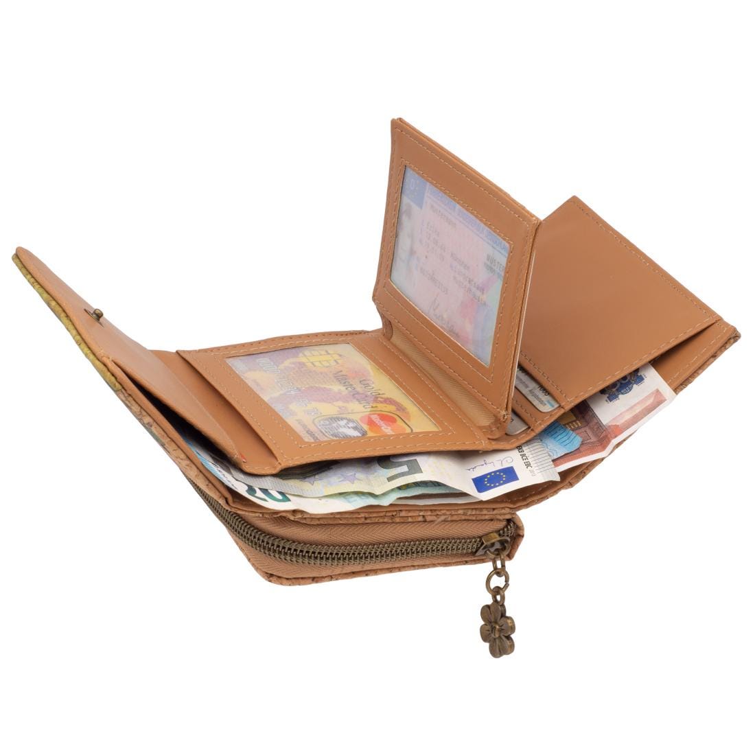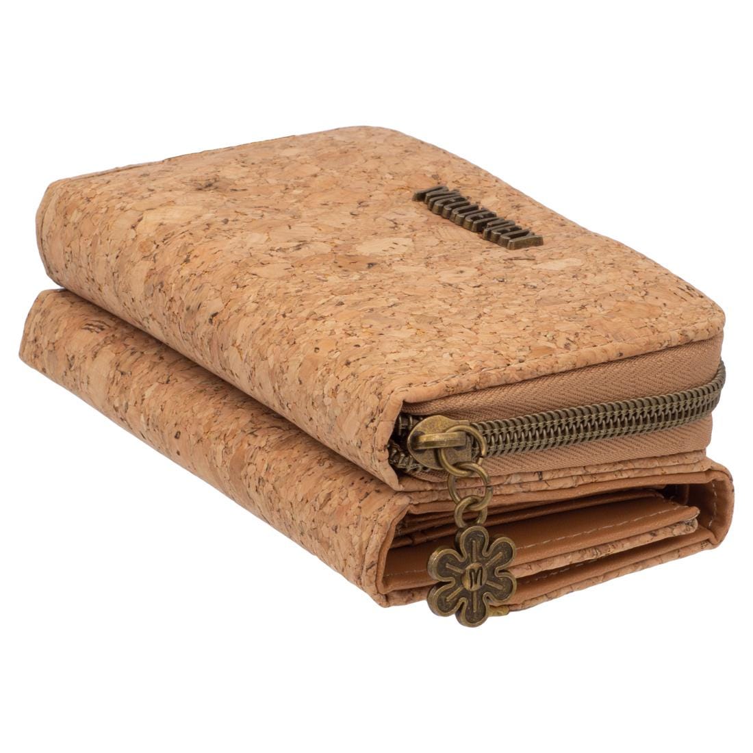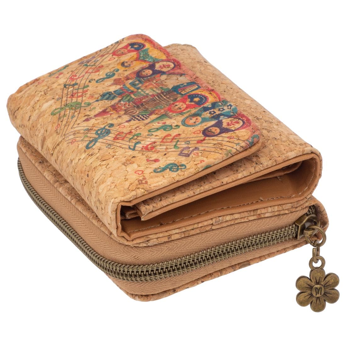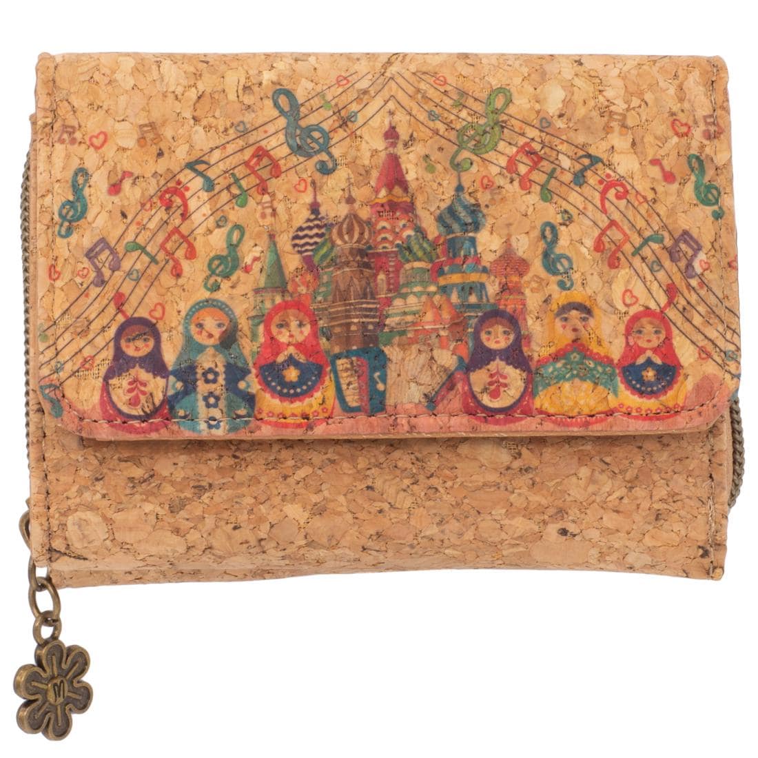 This trifold women's wallet combines creative design with sustainable functionality. Made from natural, vegan cork, it features a colorful matryoshka doll motif and playful musical notes on the exterior. Inside, it offers ample space for cards, bills, and coins—all securely enclosed by a wraparound zippered compartment. A metal flower-shaped charm adds a charming accent. Ideal for style-conscious women with a sense of environmental responsibility and individuality.
