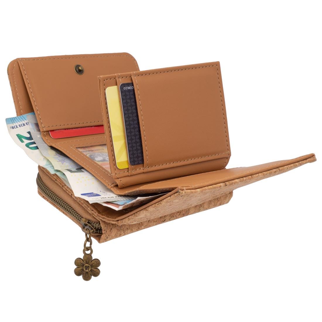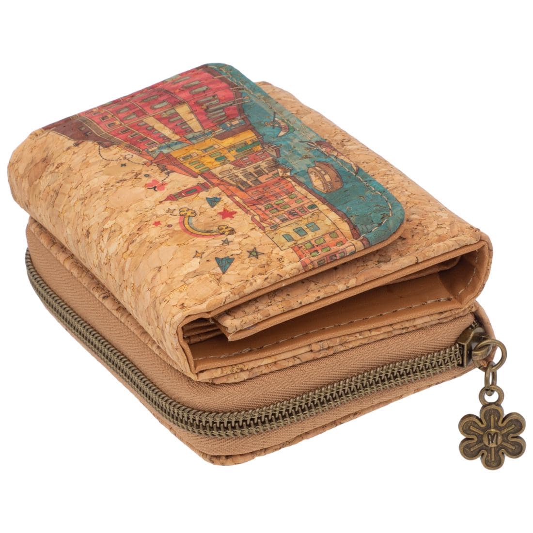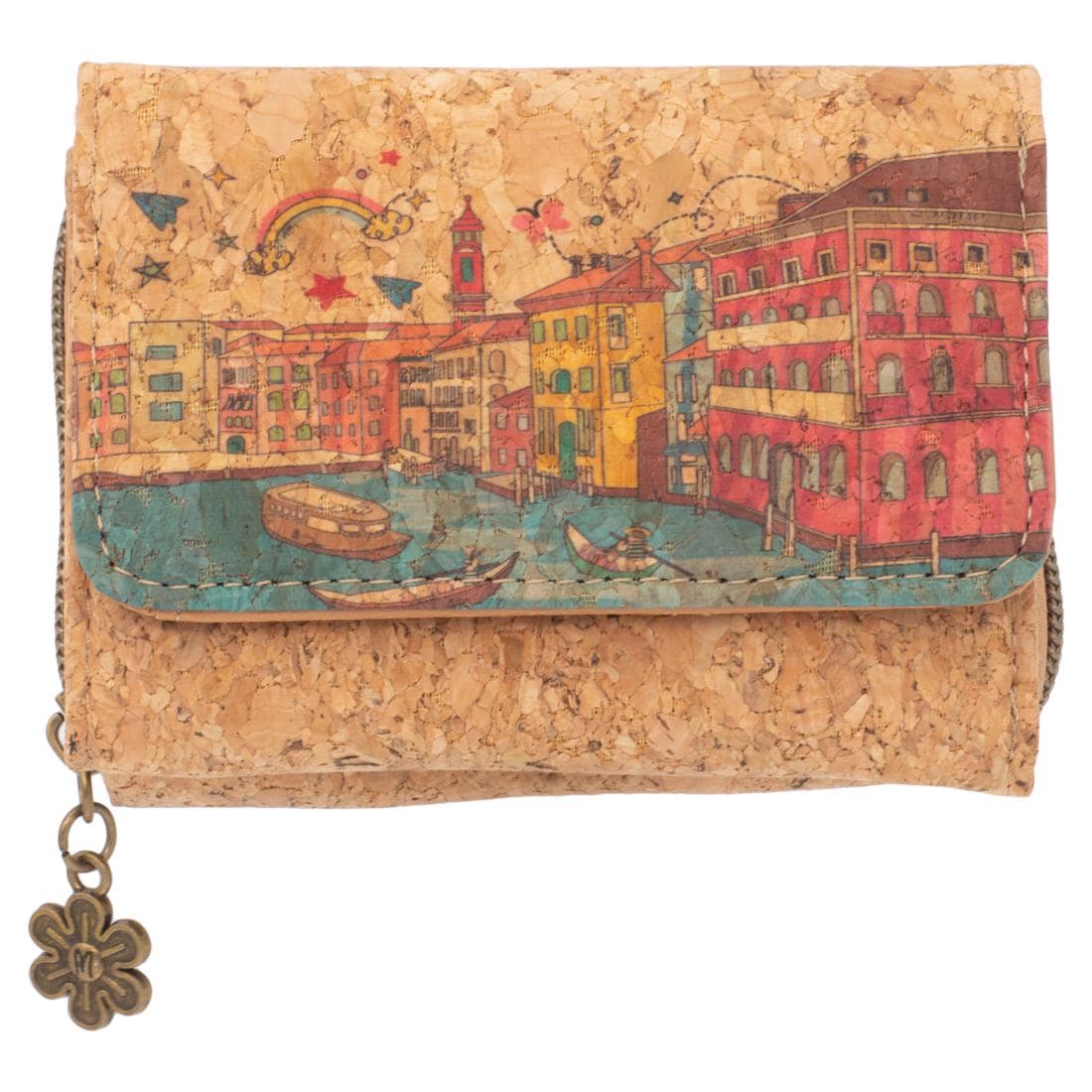 This lovingly designed women's wallet made of natural cork is not only a visual highlight but also a functional must-have. The colorful motif featuring Venetian buildings, water, and bridges exudes Mediterranean charm. Inside, the wallet offers a clever layout with a clear window for ID cards, card slots, a compartment for bills, and a separate zippered compartment for coins. Thanks to its compact size, it's ideal for everyday use, travel, or as a stylish gift.