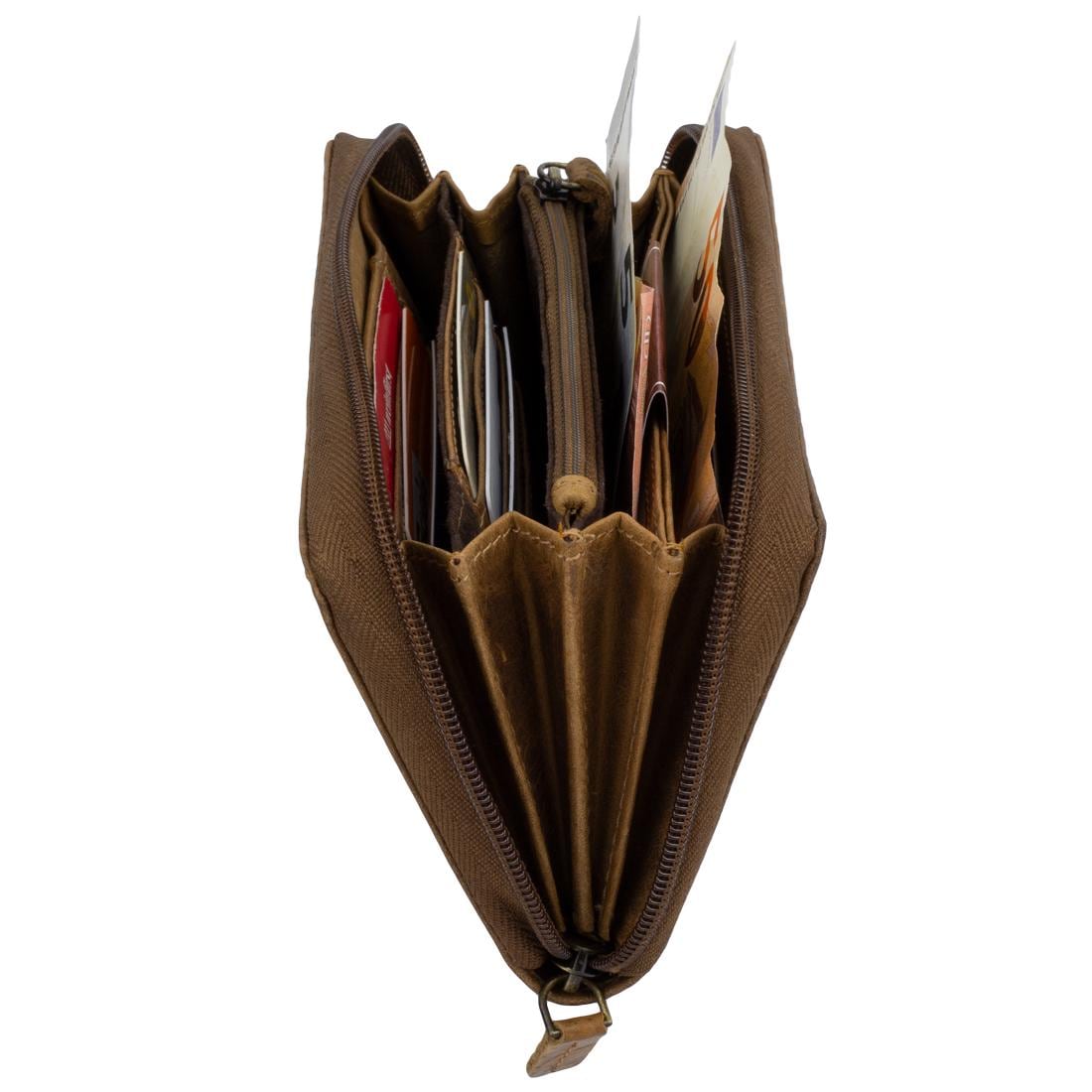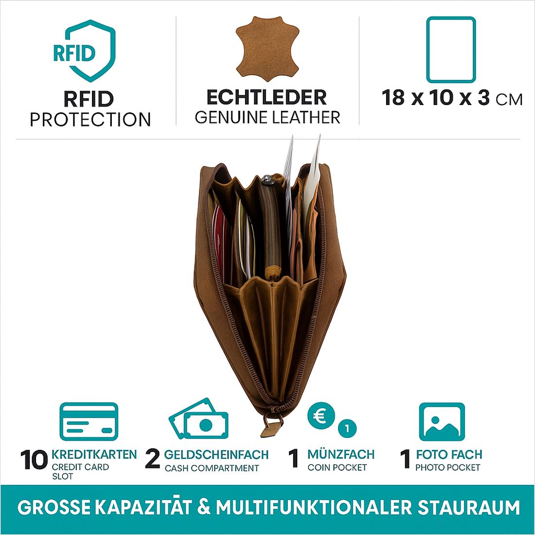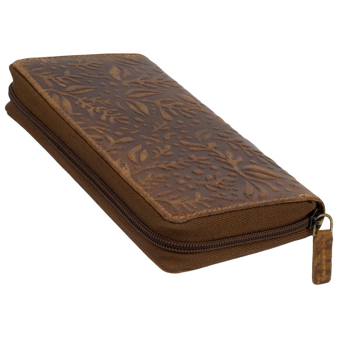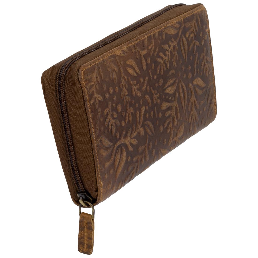 This zip-around wallet relies on proven craftsmanship: genuine cowhide leather with an elegant floral embossing, neatly stitched, and durable for everyday use. Inside, the structured layout ensures clarity: 10 card slots, 2 bill compartments, a central zippered coin pocket, and a photo/ID slot. The wraparound zipper keeps everything securely together, and RFID protection blocks unauthorized scanning. The result: a classic look, timeless robustness, and zero compromises.