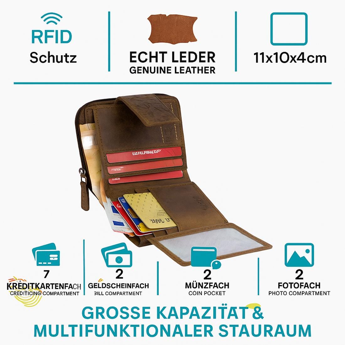 With 7 card slots, 2 bill compartments, 2 separate zippered coin pockets, and 2 photo slots, this wallet keeps everything neatly organized – all in a handy 11 × 10 × 4 cm size. In short: small format, high utility, zero compromises.