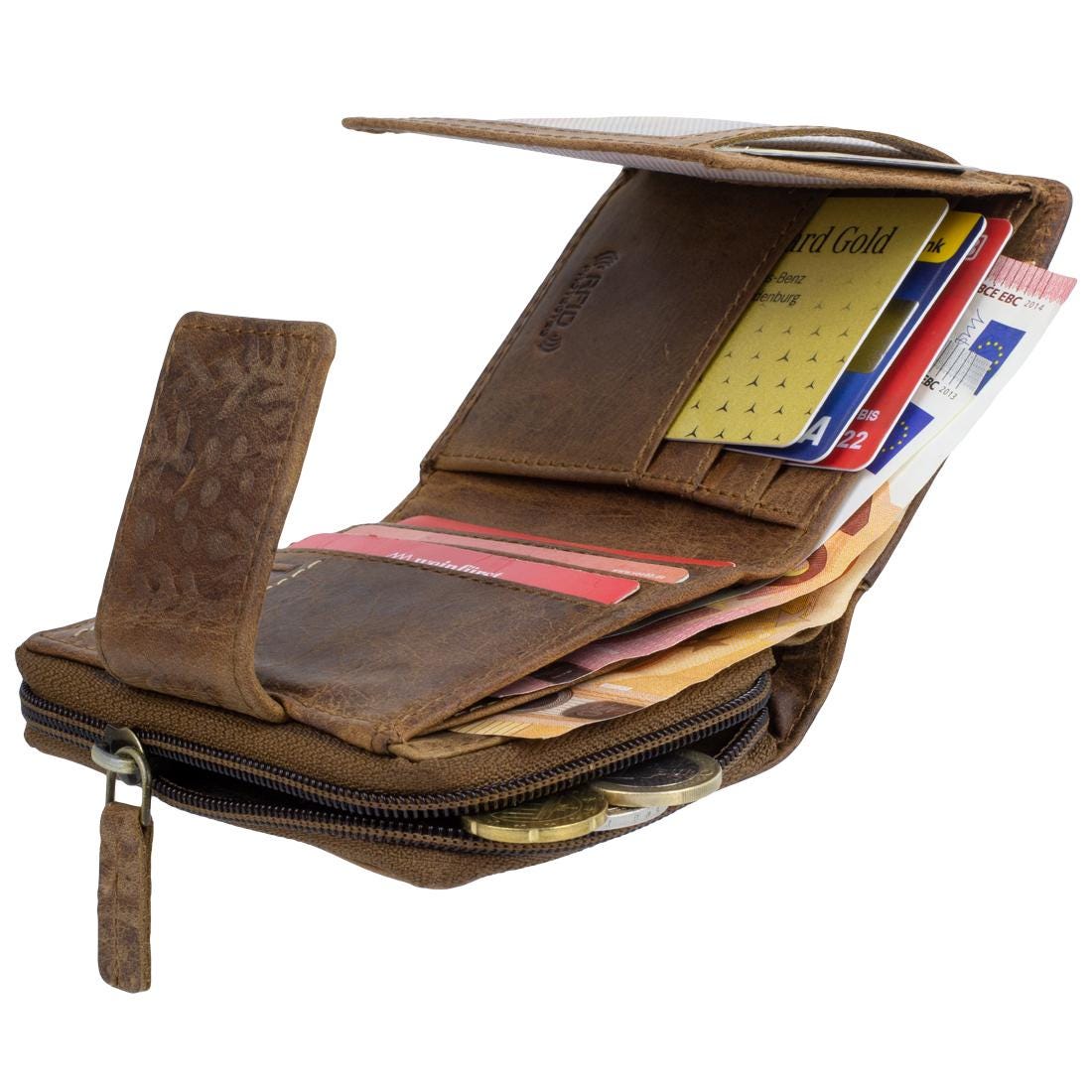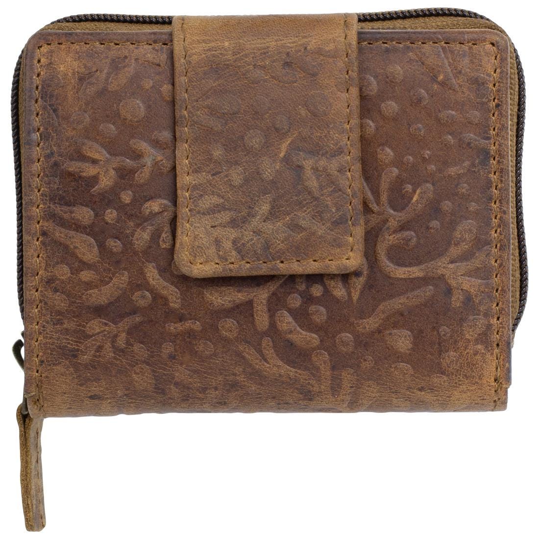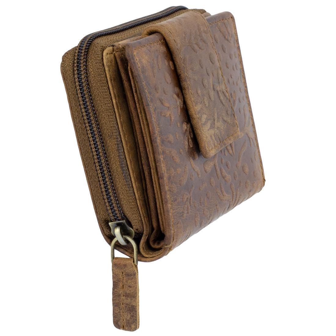 This compact women's wallet made of genuine cowhide leather offers exactly the setup that matters in everyday life: a clean structure, robust construction, and a look that will still work in five years. The warm brown tone with floral embossing adds subtle vintage charm, while the integrated RFID protection reliably safeguards your cards against data theft.