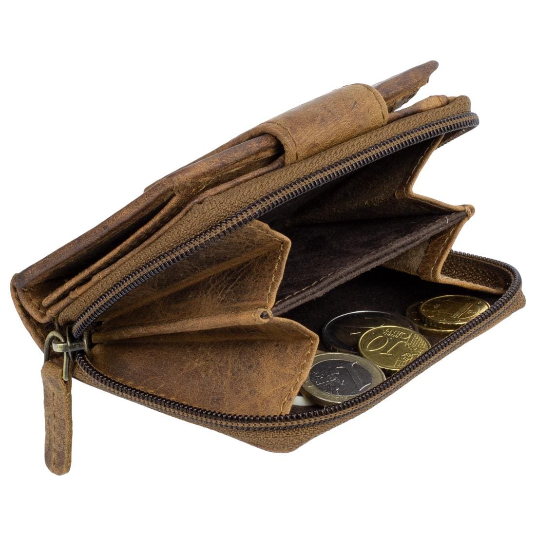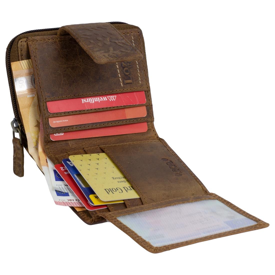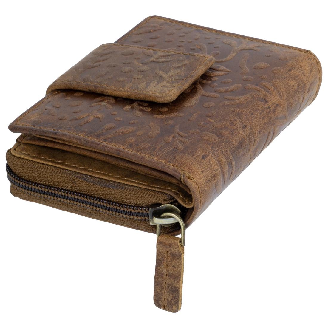 This compact women's wallet made of genuine cowhide leather offers exactly the setup that matters in everyday life: a clean structure, robust construction, and a look that will still work in five years. The warm brown tone with floral embossing adds subtle vintage charm, while the integrated RFID protection reliably safeguards your cards against data theft.