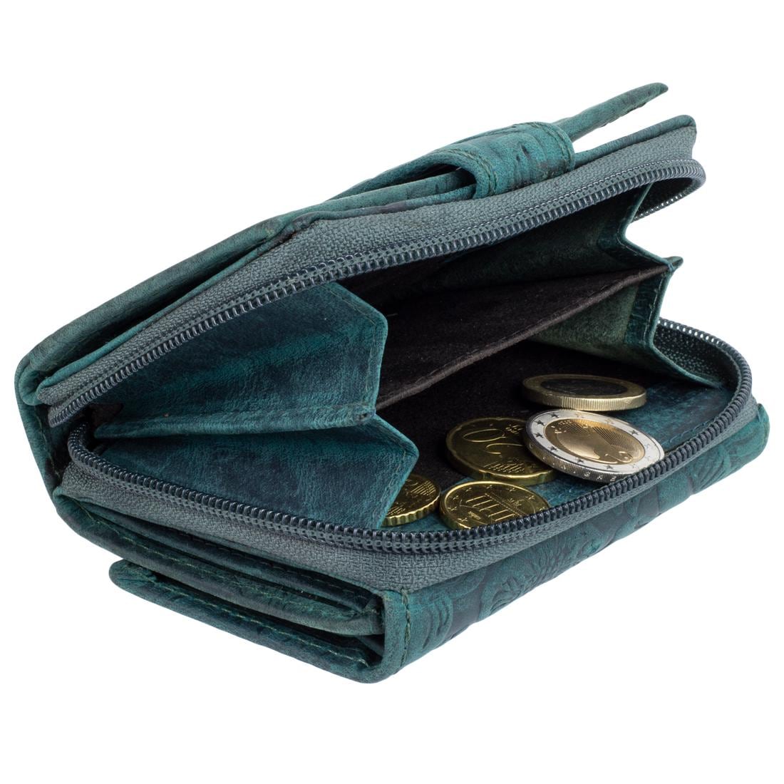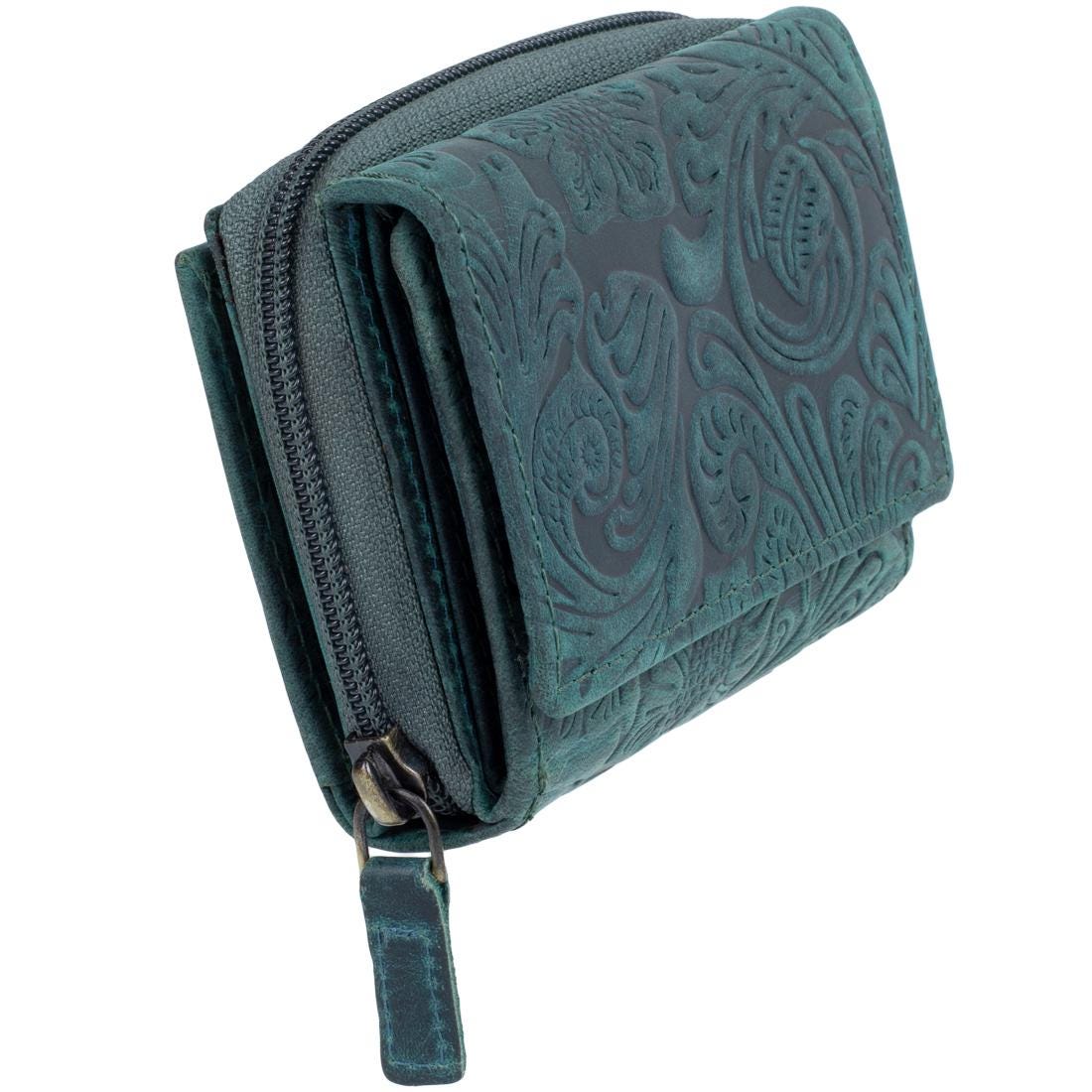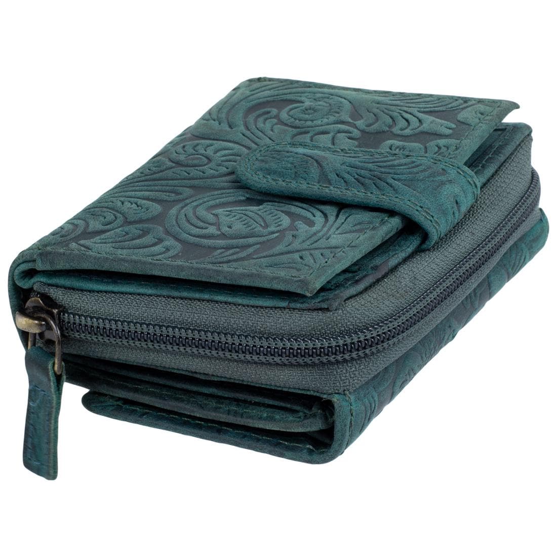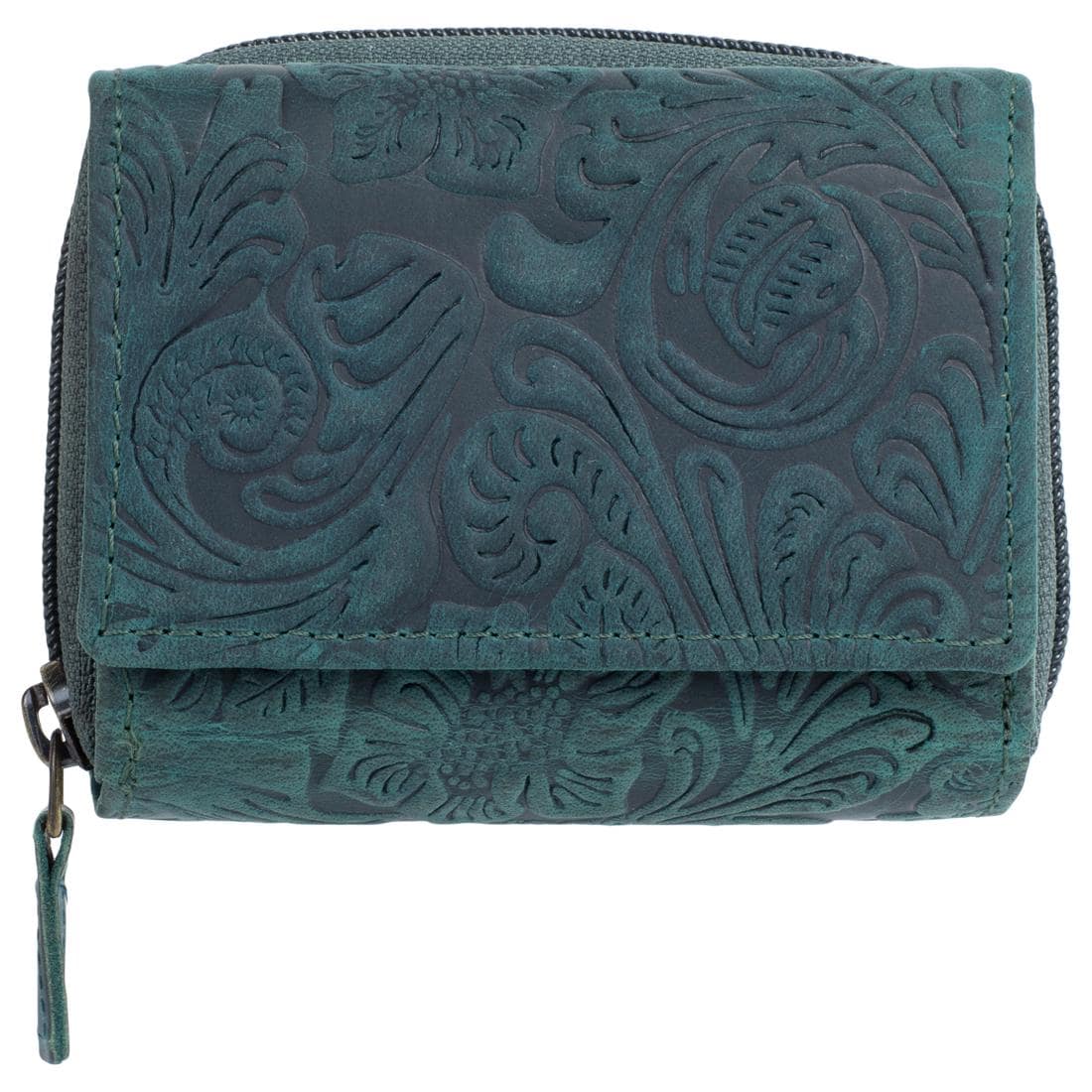 This compact women's wallet made of genuine cowhide leather impresses with its structured organization and exceptional look: the embossed floral pattern in rich fir green brings style and tranquility to everyday life.