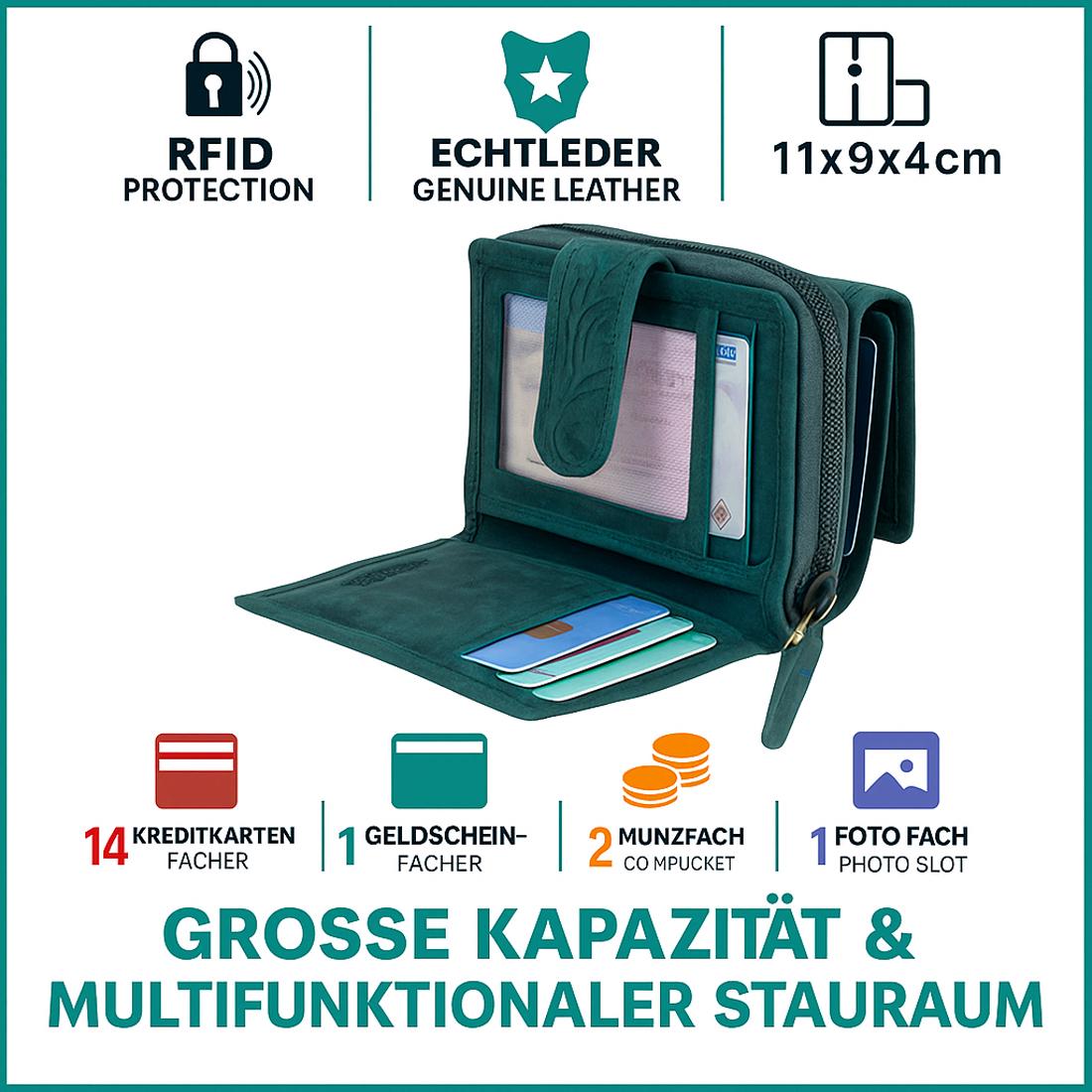 RFID Women's Wallet Genuine Leather Green – 14 Card Slots, 2 Coin Pockets, Floral Embossing, 11×9×4 cm