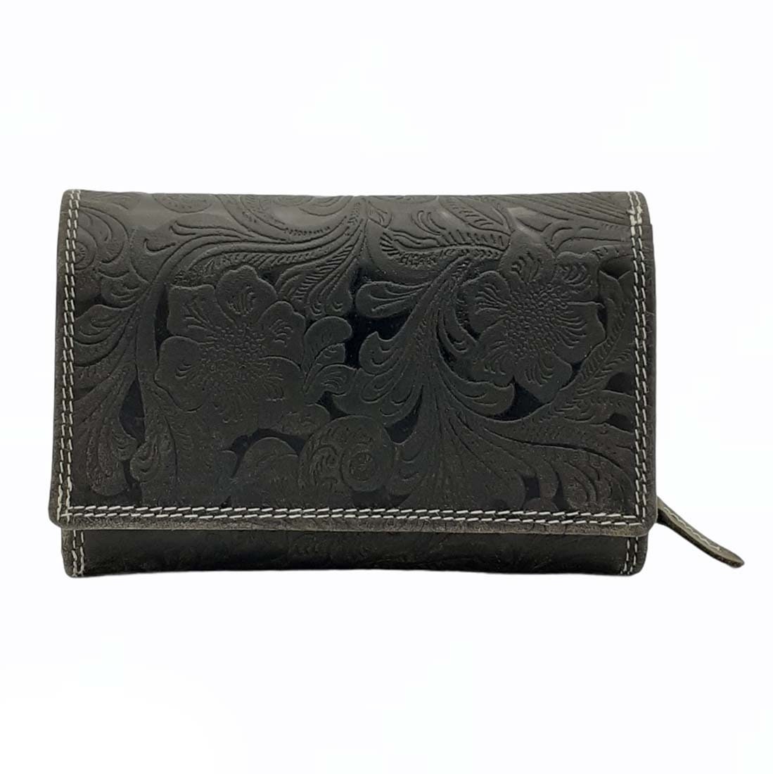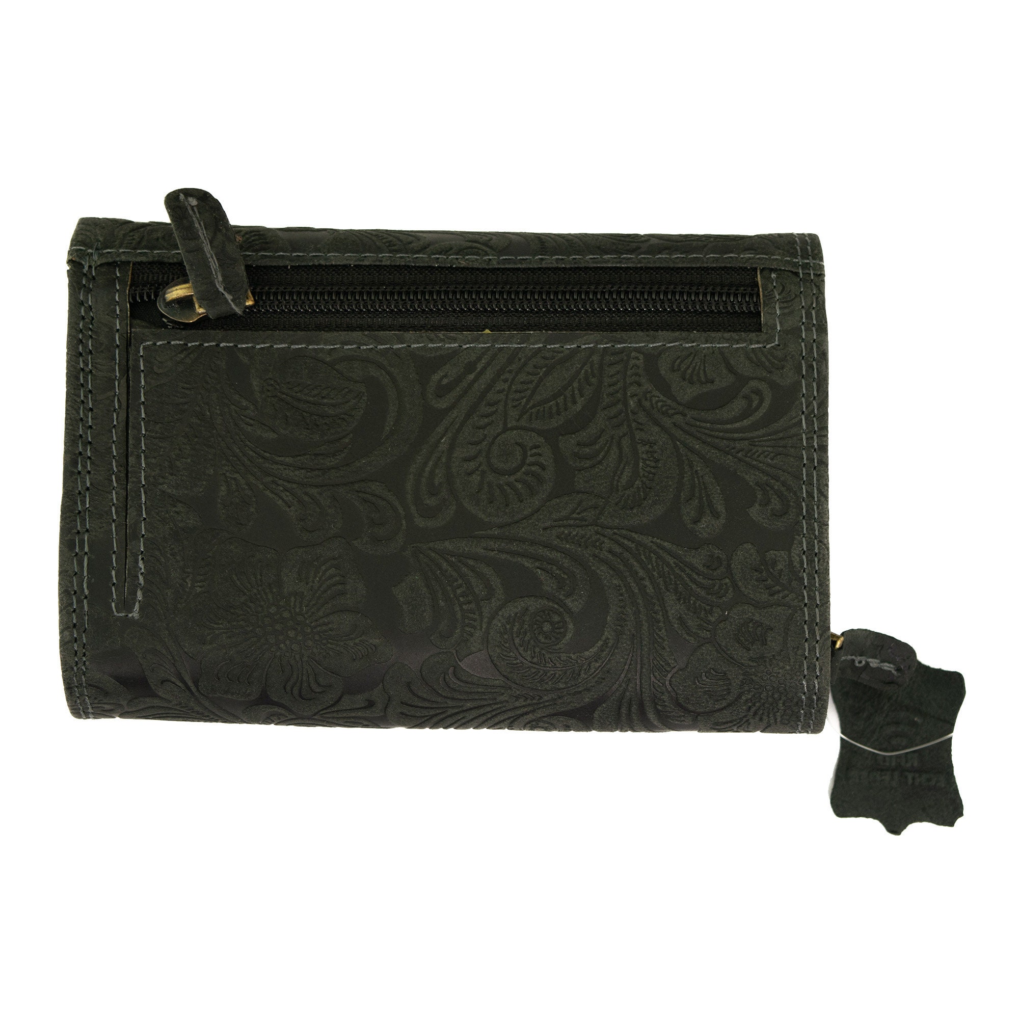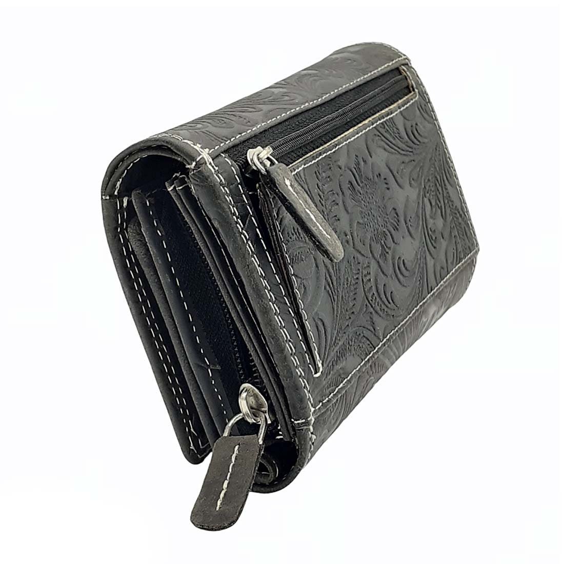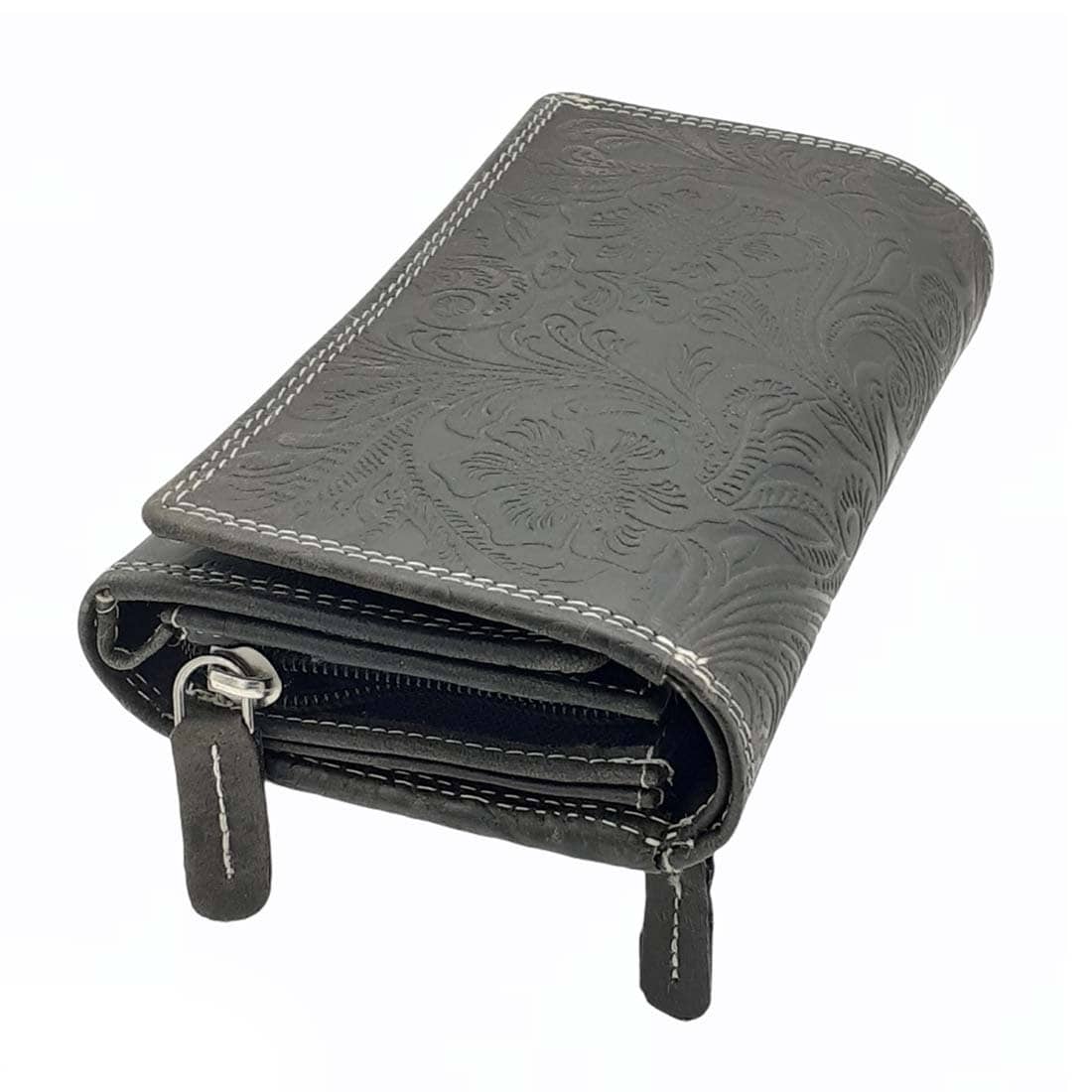 100% genuine buffalo leather, protective exterior embossed with antique style floral print, durable and water-repellent in anthracite color.