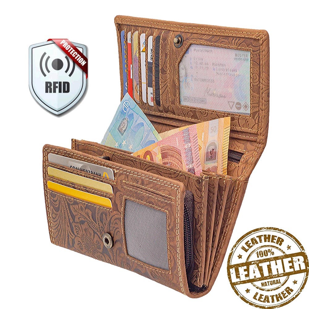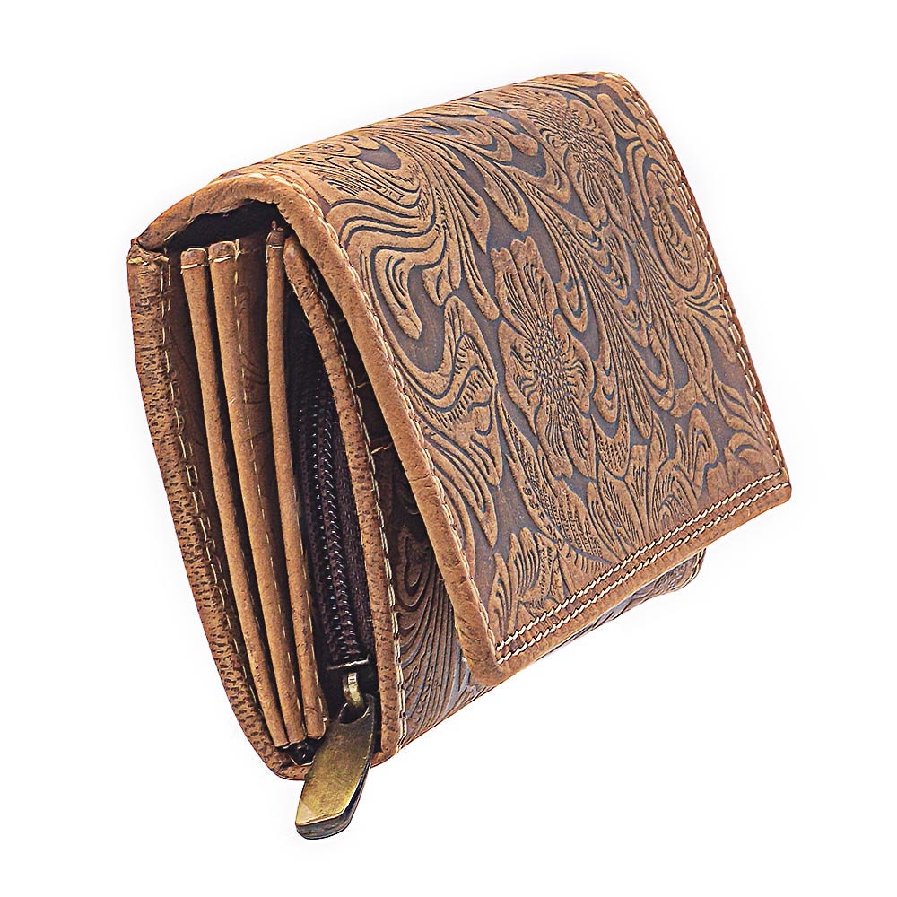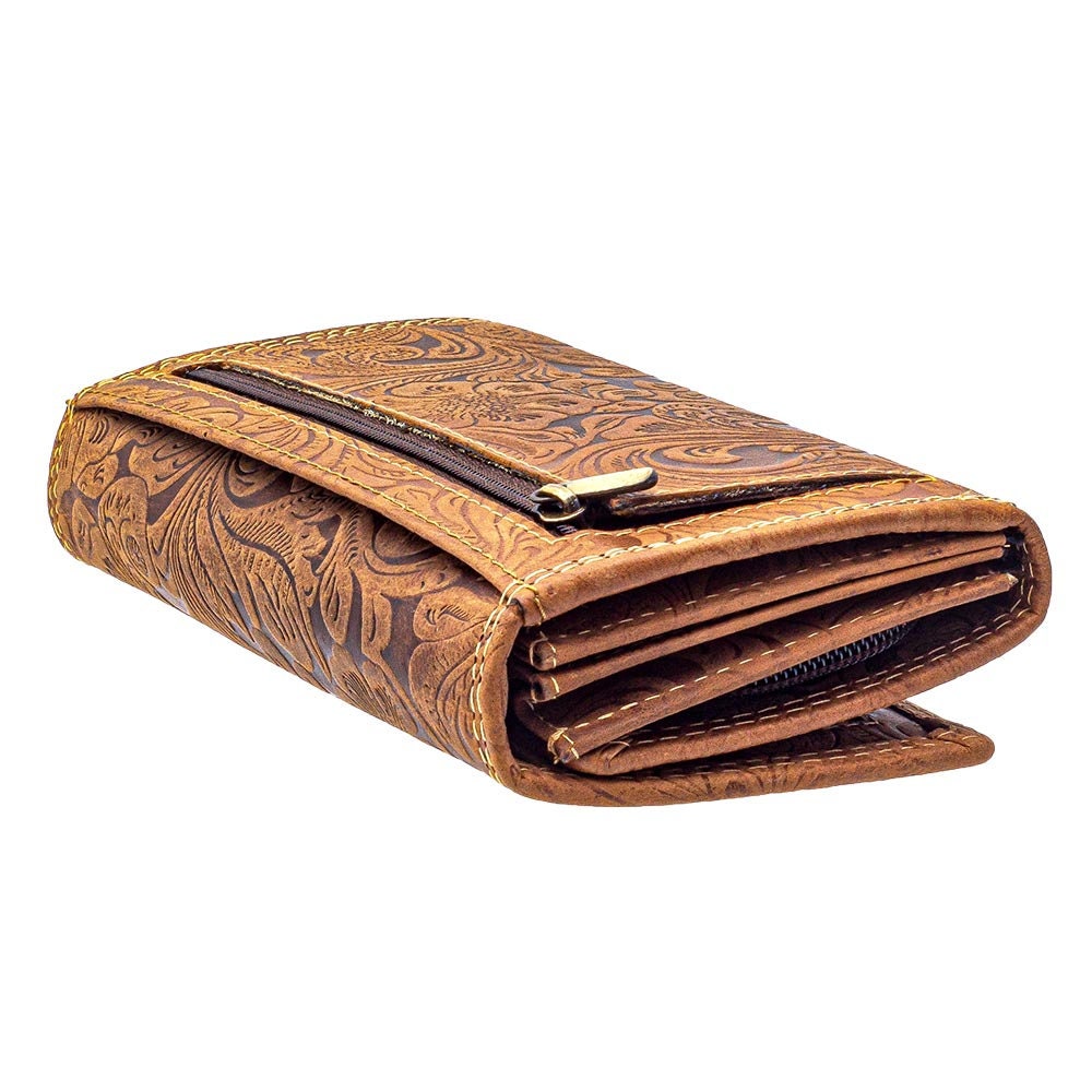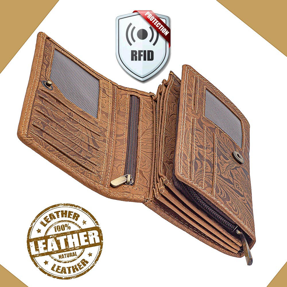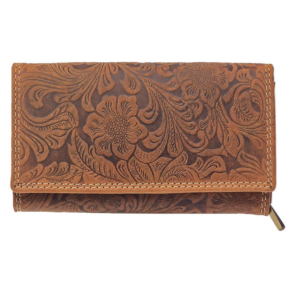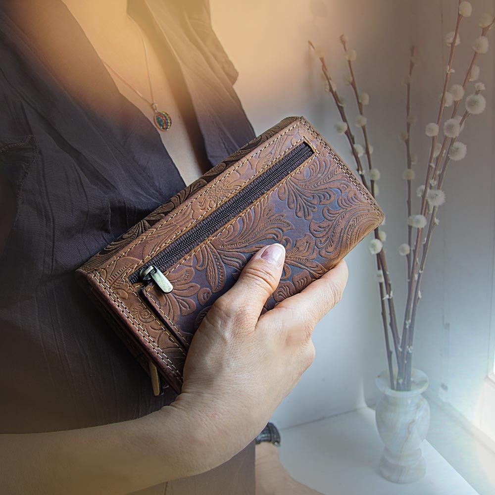100% genuine leather, protective exterior embossed with antique style floral print, durable and water-repellent with RFID protection in brown color.